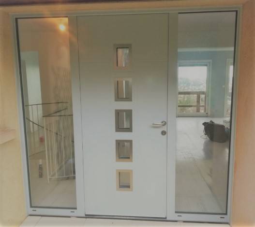 Sur cette pose réalisée par Romain et Hervé, on peut voir une porte en aluminium, un ventail avec fixes latéraux de gamme Euradif, modèle Santa Cruz 3.